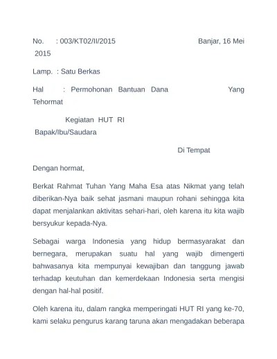 Biasanya kita menggunakan proposal sebagai bentuk permohonan bantuan dalam bentuk dana, ataupun dukungan. Hut ri merupakan suatu yang sangat dinantikan oleh semua warga masyarakat indonesia, hal ini karena pada tanggal 17 agustus biasanya banyak . Sertakan kebutuhan biaya yang dibutuhkan dalam kegiatan . (proposal kegiatan dan anggaran biaya terlampir). Seperti contohnya acara perlombaan 17 agustusan setingkat desa , panitia acara bisa meminta bantuan dana langsung ke kelurahan dan kecamatan , .